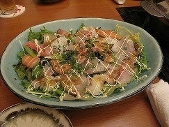 左から順に、【朝〆鮮魚のお造り】【モッツァレラチーズの薩摩揚げ】【雛鶏の竜田揚げ サラダスタイル】