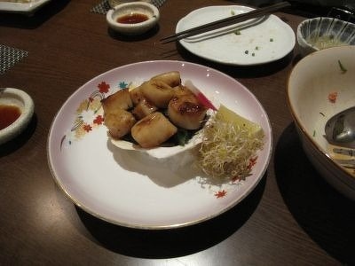 ホタテとメインの黒毛和牛の鉄板焼き。