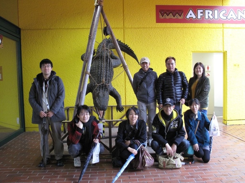 アフリカンプラザの前で吊るされていたワニの前で記念撮影