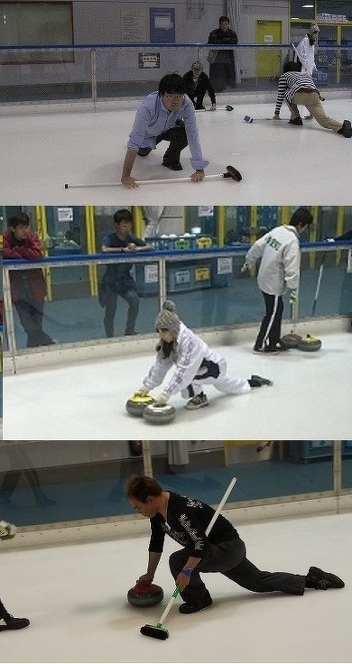 最初はストーンを投げる体勢練習。