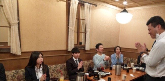 2020年 ランチ会 新入社員を迎え、顔合わせも兼ねたランチ会を開催しました。 初めて顔を合わせる社員の方々を前に少し緊張した面持ちの新入社員さん達。 まずは乾杯!! ランチなのでお茶での乾杯です。 社長から新入社員の方々へ祝辞をいただきます。 いよいよ料理が運ばれてきました。 てんぷらに、お刺身に、焼き魚と豪華です。 ご飯を食べたら、次は全員で自己紹介。 最後は全員で一回締めをして終了です。 新入社員の皆さん、これからよろしくお願いします。